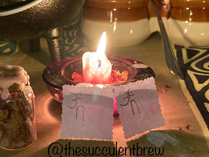 I copied the sigil onto the three small papers – two copies for us to carry with us, and one to store in a jar at our family alter.