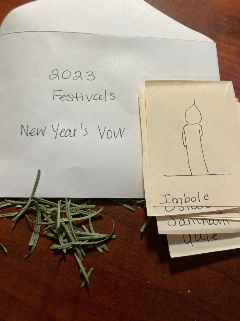 After the first set of papers were burned, along with the pine needles, I then placed the duplicate set of festival images into a small envelope along with a fingerful of needles, sealed and labelled. This envelope will stay at my alter as a reminder of my intention to observe and celebrate the Wheel of the Year.