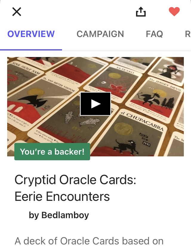 This is an oracle deck based on various Cryptids and includes some of my favorites, like the Jersey Devil, el Chupacabra, and Mothman. This campaign ends March 28th.